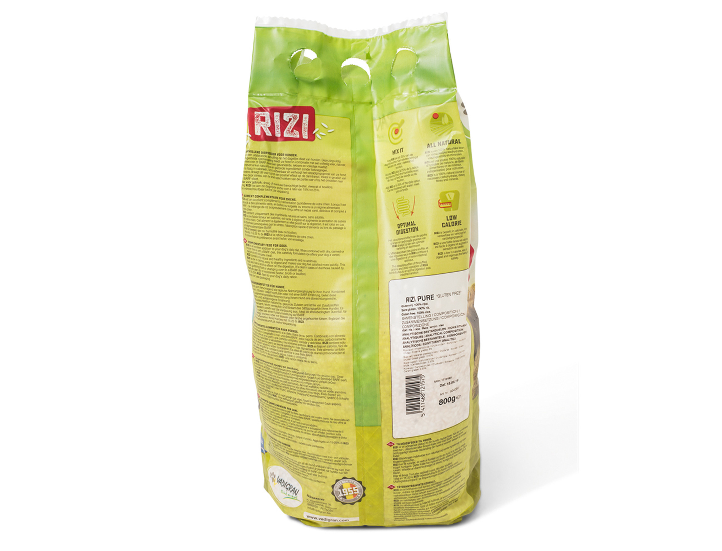 RIZI Pure bevat enkel witte gepofte en gebroken rijst en is glutenvrij.RIZI is een rijstmengeling voor alle honden en bevat enkel natuurlijke, gezonde en herkenbare ingrediënten zonder toevoegingen, is laag in calorieën en verhoogt het verzadigingsgevoel van de hond.Het absorberende effect van de gepofte granen draagt positief bij tot een optimale darmtransit en een makkelijke vertering.RIZI is een waardevolle en essentiële bron van koolhydraten, voedingsvezels en mineralen; kan in combinatie met droogvoer, natvoer, diepvriesvoer of BARF (Biologically Appropriate Raw Food) gegeven worden.