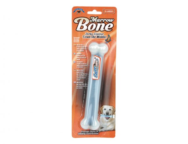Marrow Bone is een duurzaam interactief hondenbeen dat uren plezier en kauwgenot biedt. Zelfs bij de sterkste honden gaan deze Marrow Bones zeer lang mee.De lekkere rundvleessmaak binnenin stimuleert je hond voortdurend om te kauwen.Wanneer je hond kauwt, worden er op het nylon been ribbels gevormd. Deze ribbels helpen tandsteen verwijderen doordat ze dezelfde werking hebben als de haartjes op een tandenborstel.Marrow Bones zijn gemaakt van kunstmatige vezels. Deze zijn niet schadelijk bij het inslikken omdat ze het lichaam verlaten zonder verteerd te worden.De Marrow Bones zijn veilig voor binnenshuis gebruik en maken geen vlekken op tapijt of meubels.