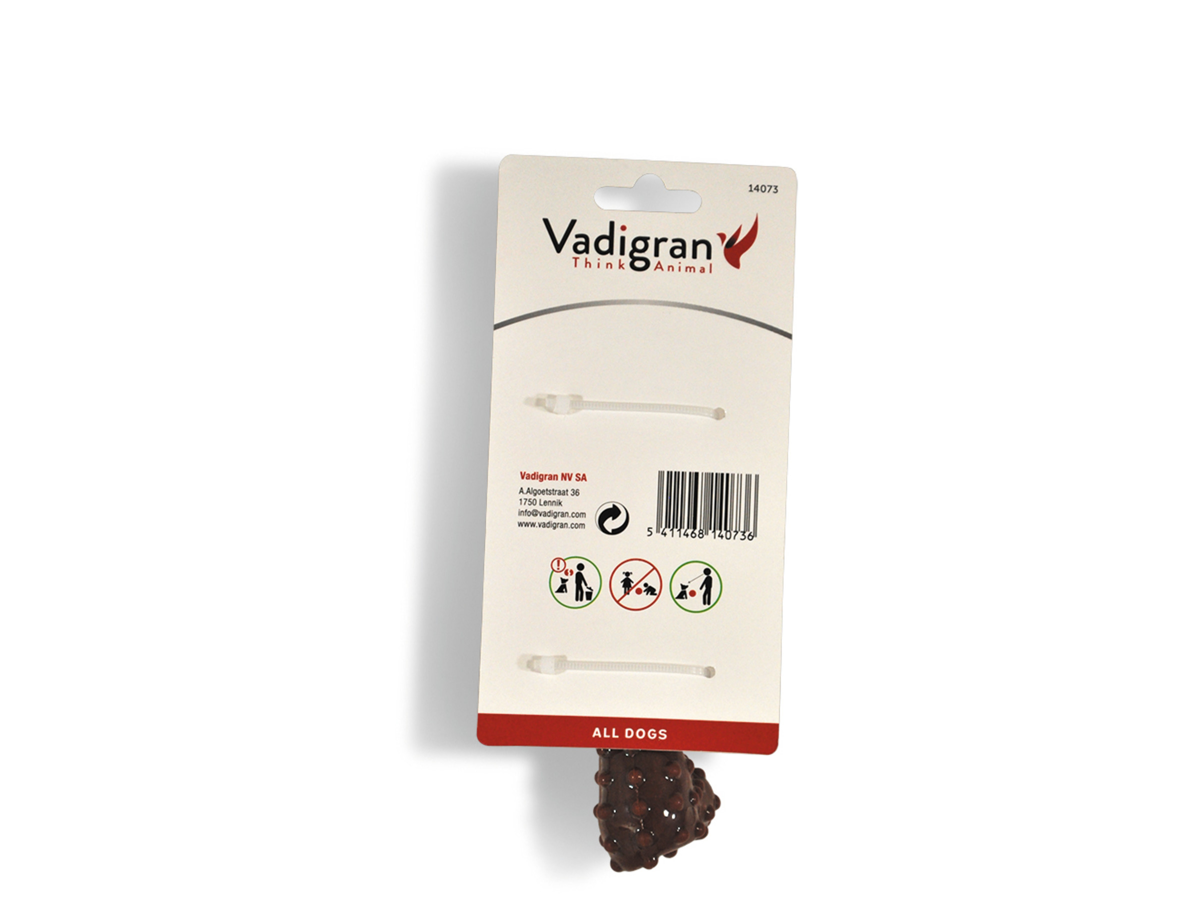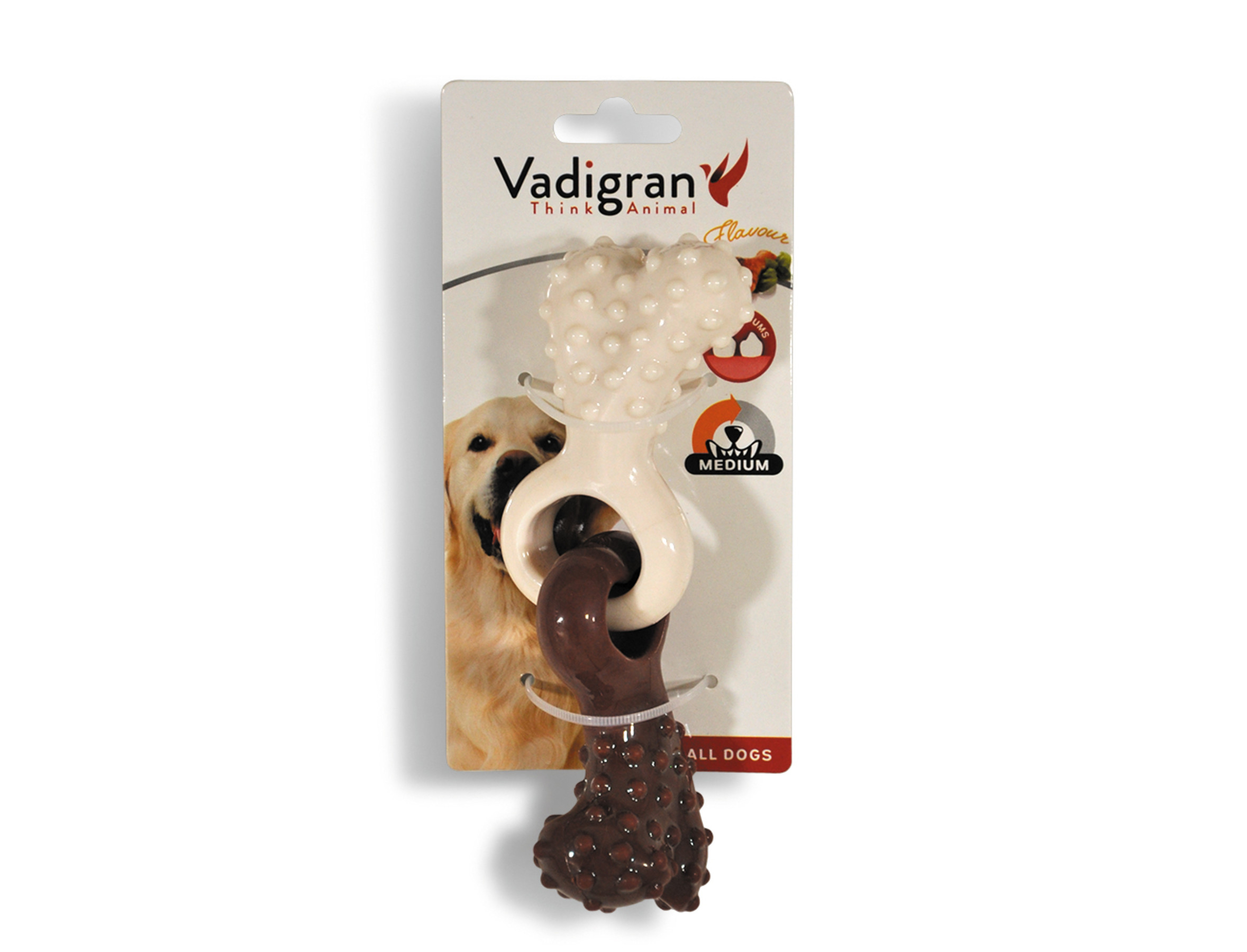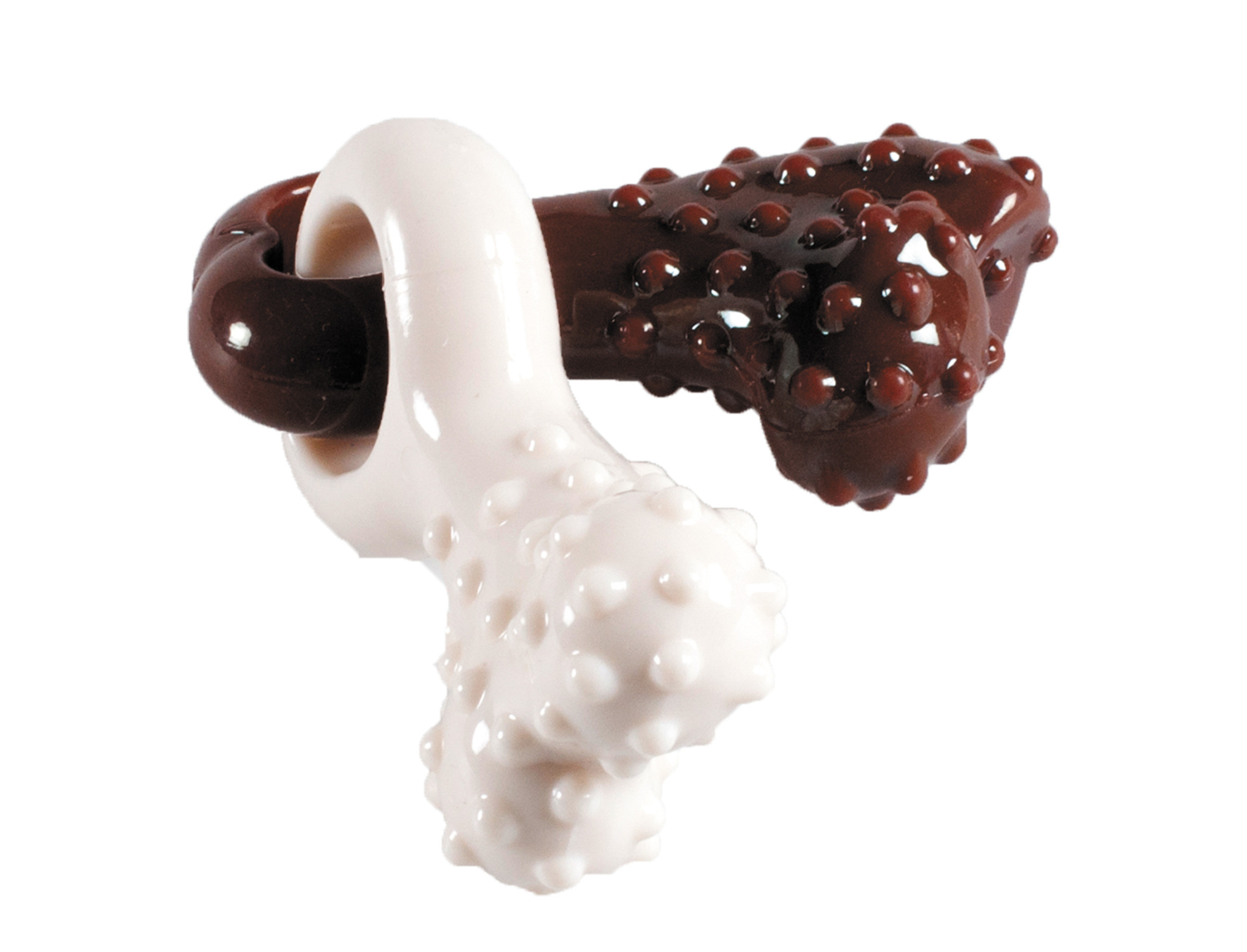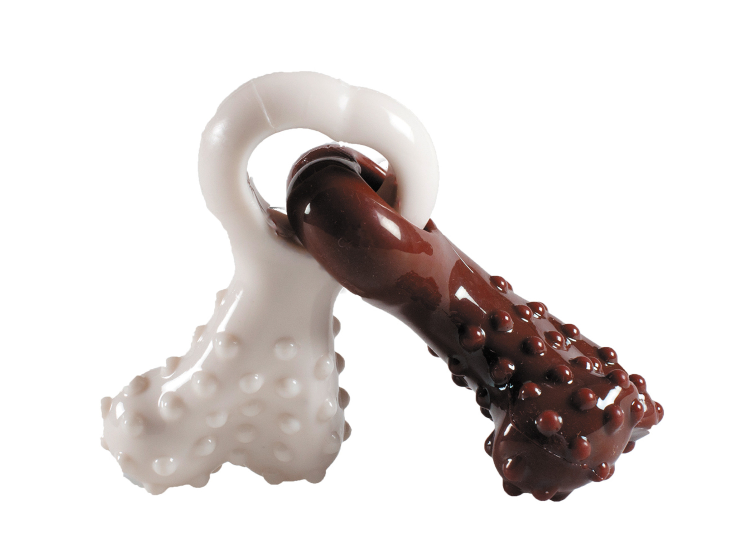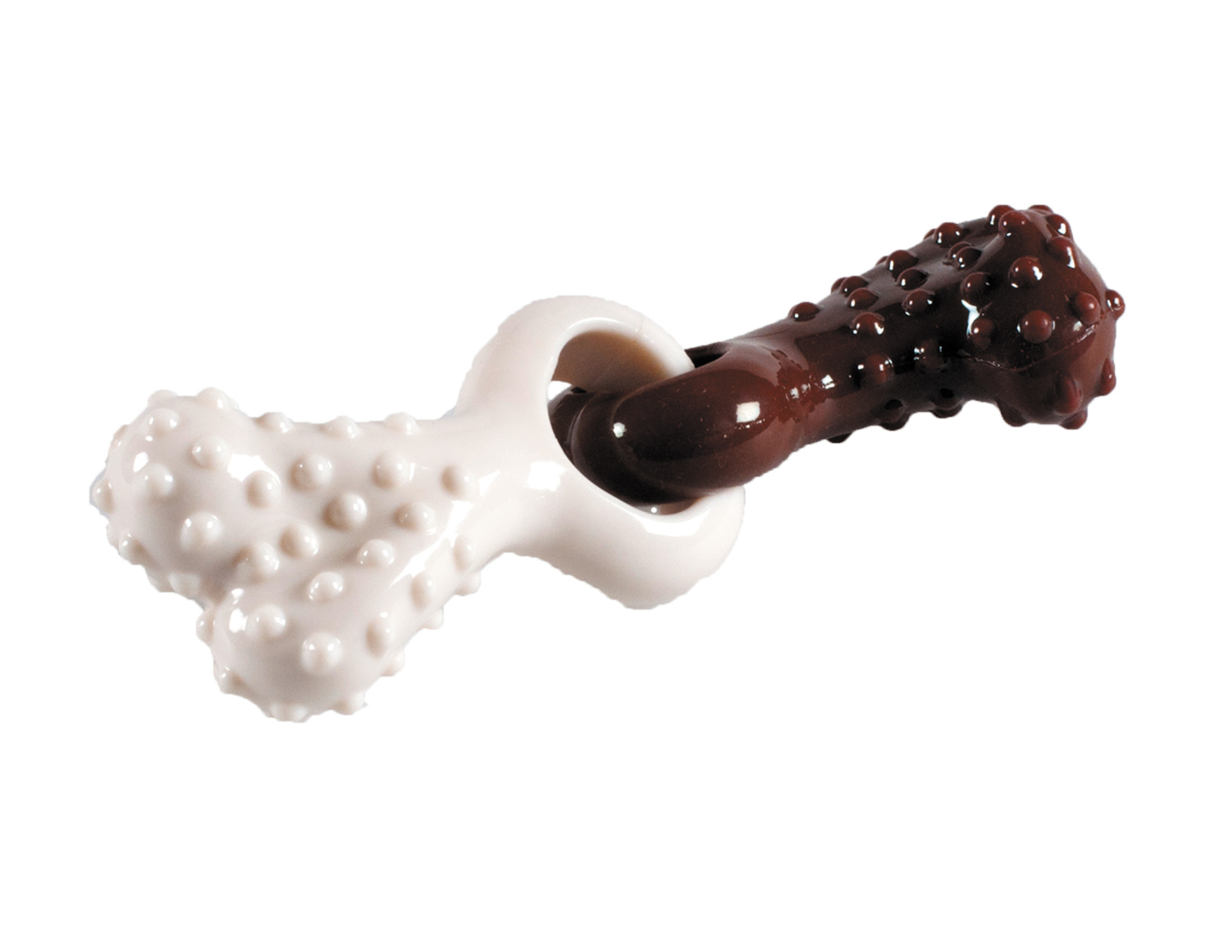 Dit speeltje voor honden en puppies bestaat uit 2 botten die aan elkaar zijn vastgemaakt. Het is gemaakt van TPR en nylon, zeer resistent materiaal, ideaal voor de hond om langdurig op te kunnen kauwen.Het pluspunt van dit speeltje is het heelijke aroma van kip dat het verspreidt. Een genot voor uw hond of puppy!Naast het plezier dat het biedt, is dit speeltje ook zeer nuttig voor de verzorging van het tandvlees van uw huisdier. De oneffenheden in het speeltje masseren het tandvlees voorzichtig.