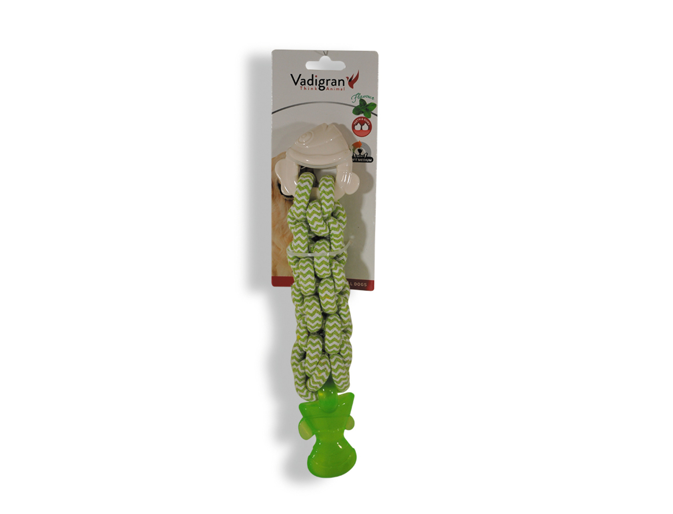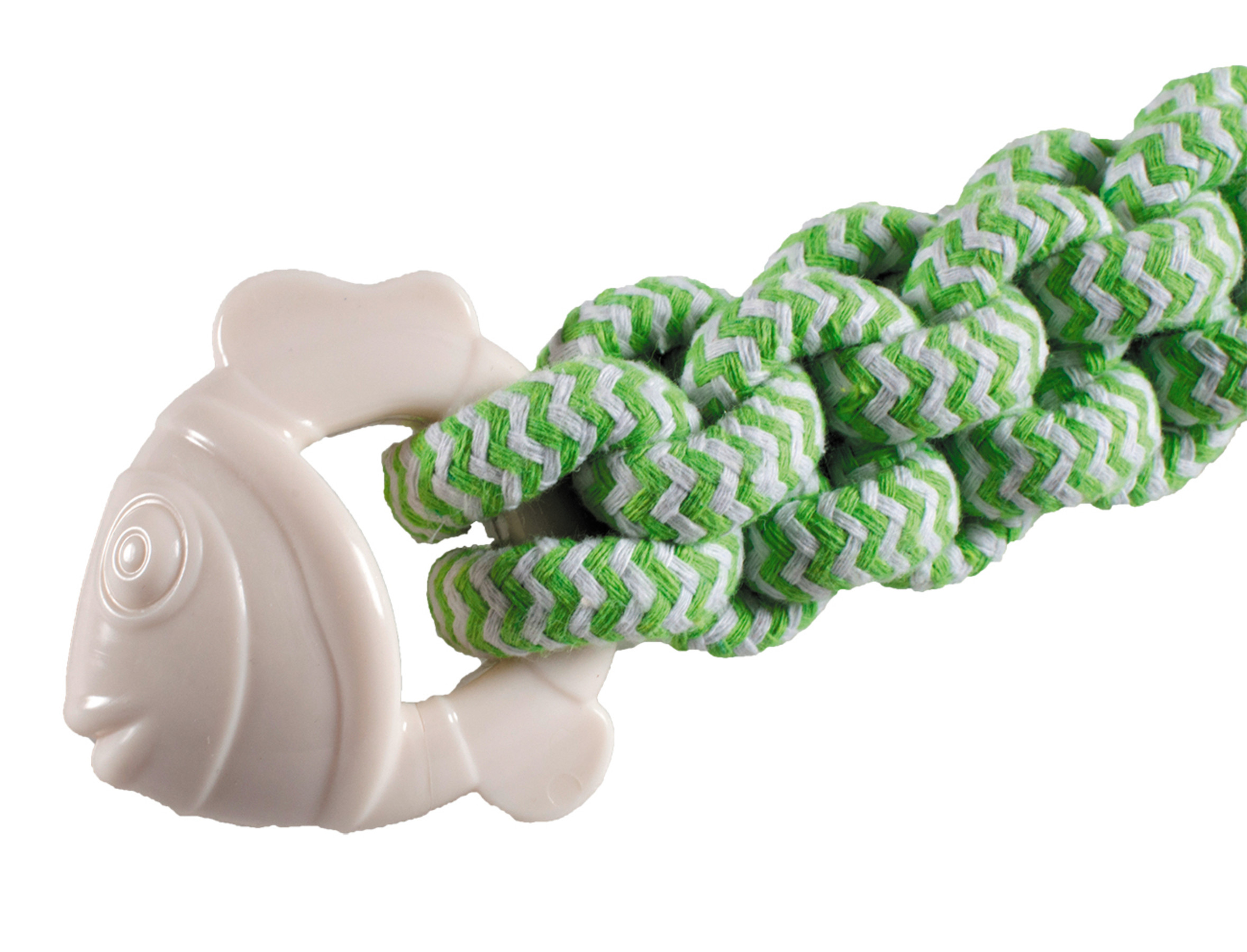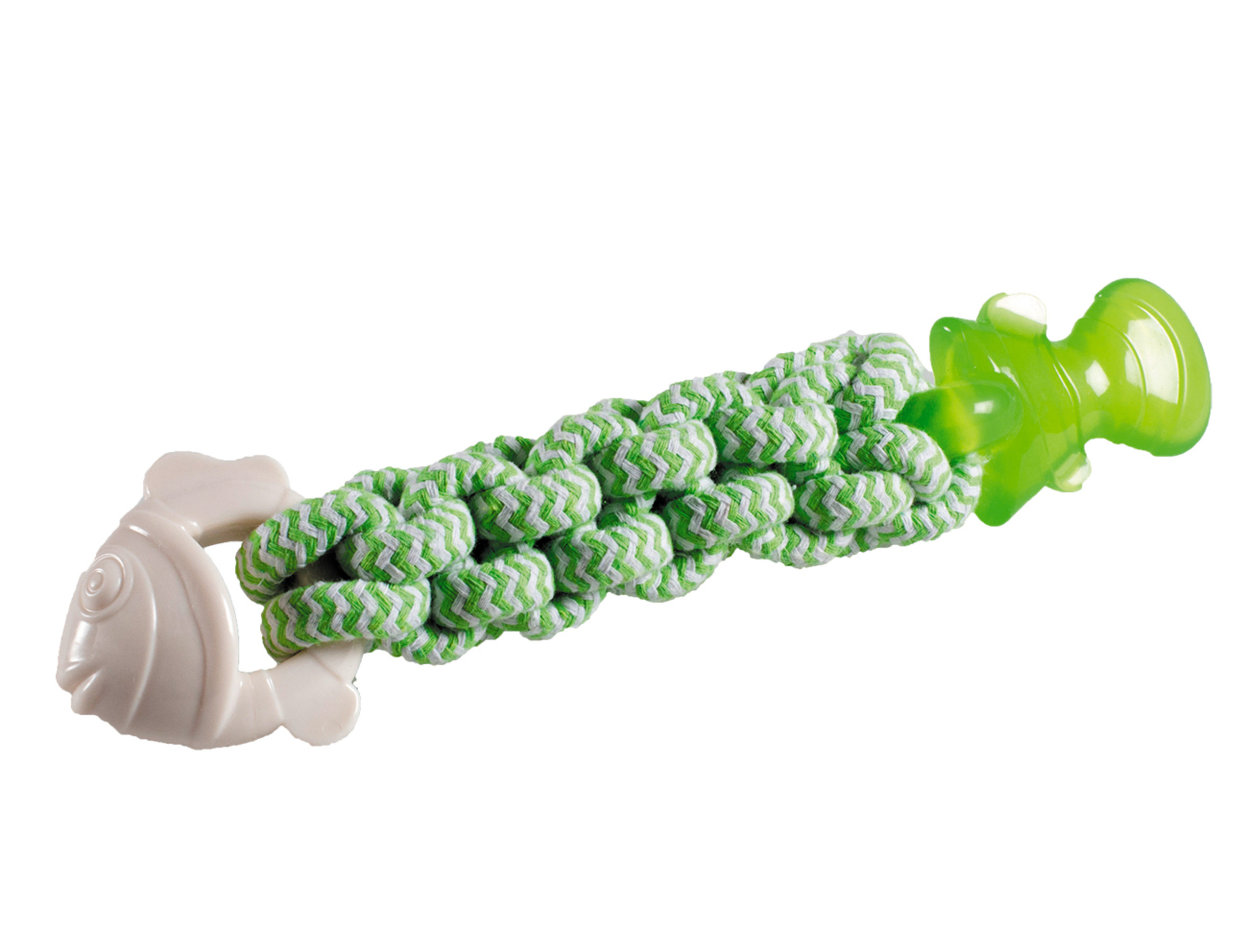 Dit speeltje voor honden en puppies bestaat uit 3 elementen: een vissenkop in TPR, een touw in nylon en een vissenstaart in TPR-schuim. Deze 3 materialen zijn resistent, zodat de hond langdurig op zijn speeltje kan kauwen.Het pluspunt van dit speeltje is het heelijke aroma van munt. Uw hond of puppy zal van zijn smaak houden en u zult de effecten ervan op zijn adem waarderen.Naast het plezier dat het biedt, is dit speeltje ook zeer nuttig voor de verzorging van het tandvlees van uw huisdier. De oneffenheden in het speeltje masseren het tandvlees voorzichtig.