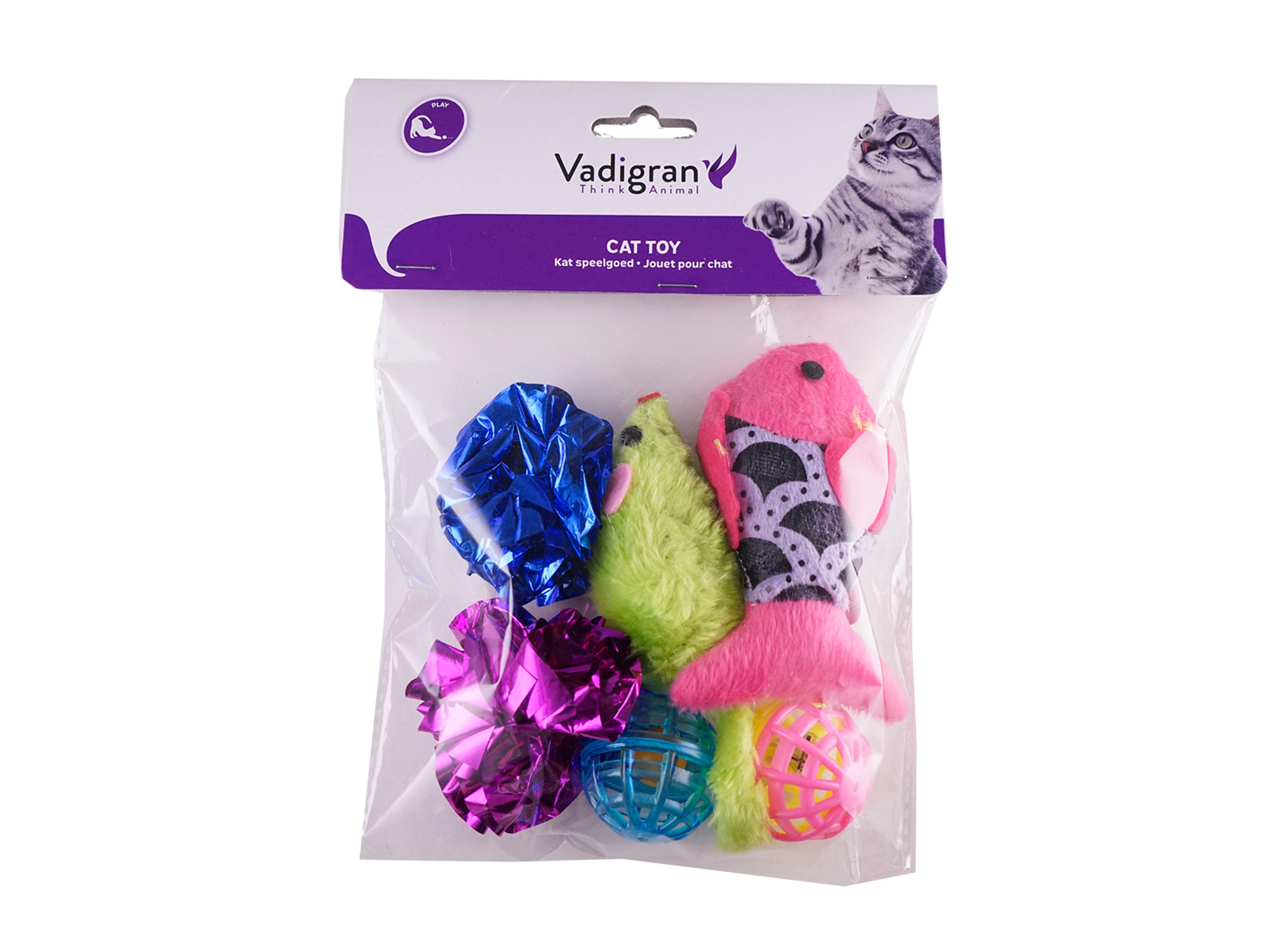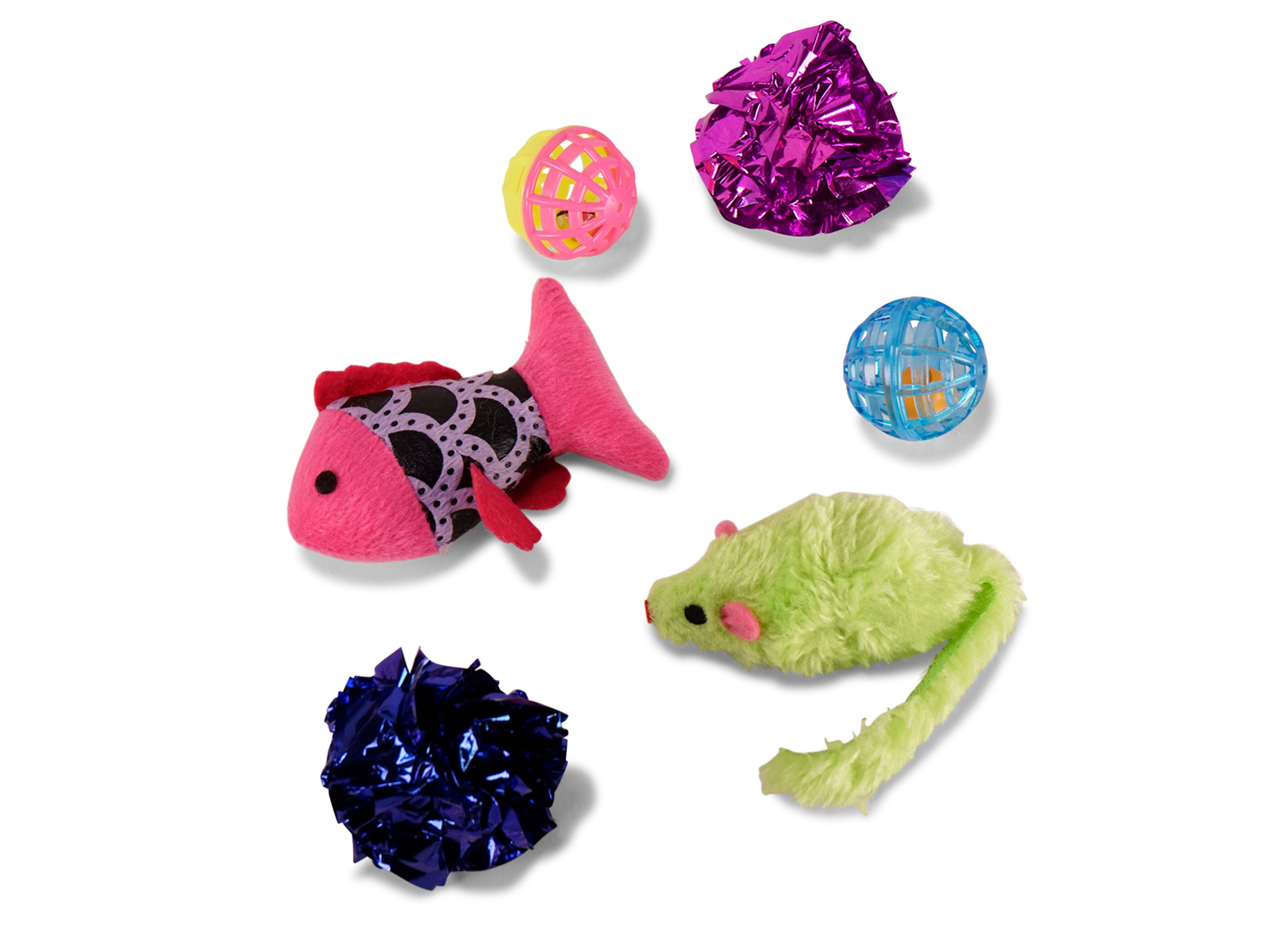 Bevat 6 speeltjes : 2 pluches met catnip, 2 balletjes en 2 crinkel speeltjes.