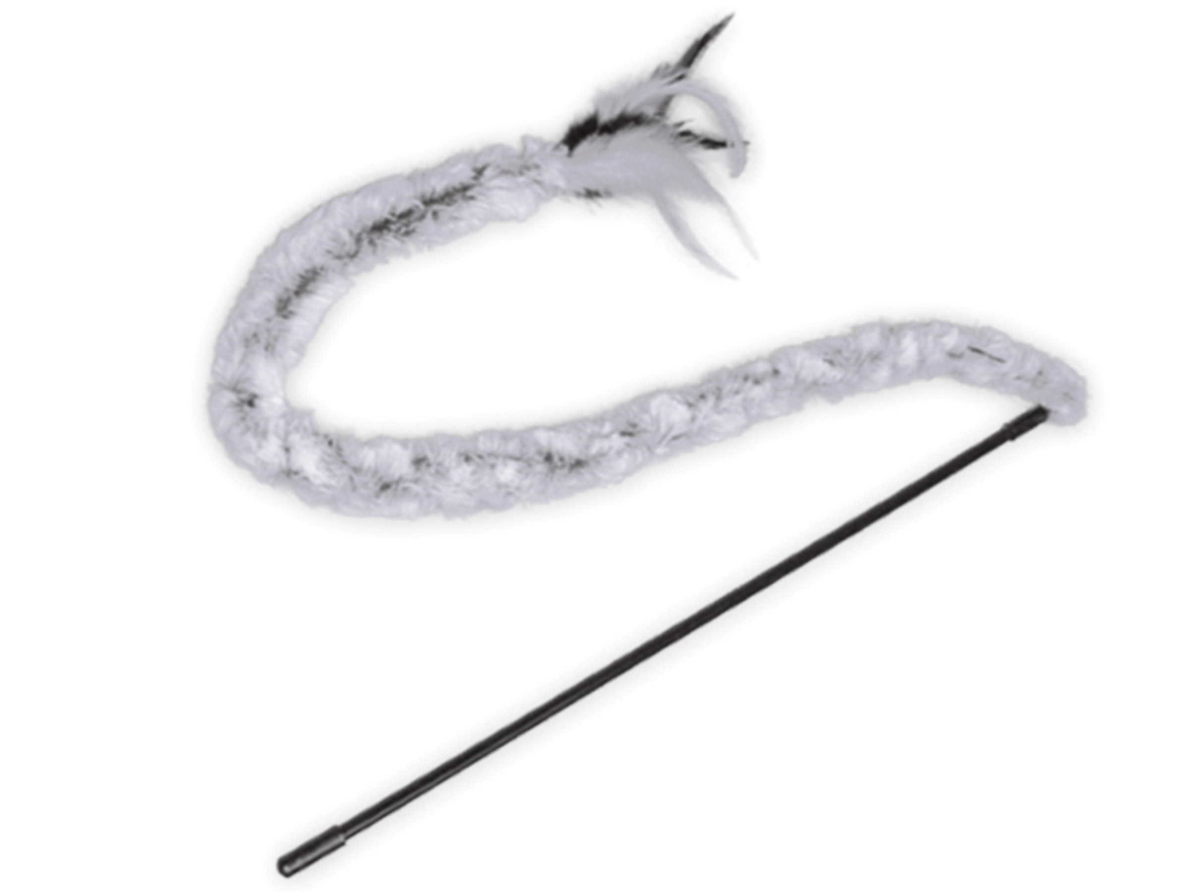 Hengel met lang zwart-geveerd pluche speelgoed.