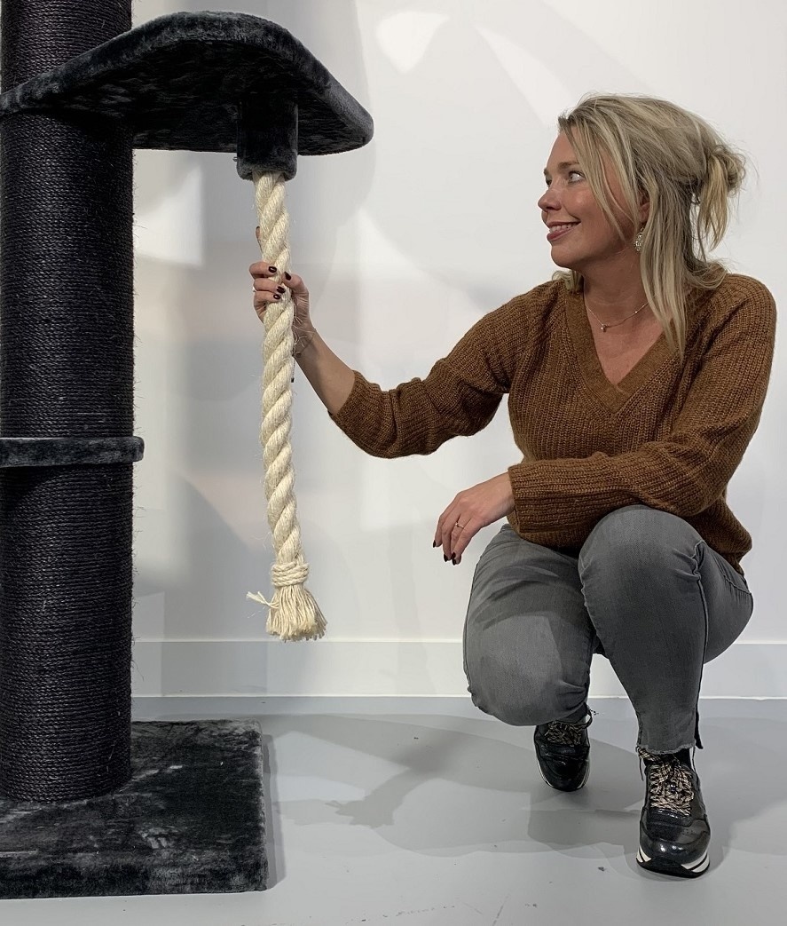 Driehoekige ligplaats met speeltouw. Makkelijk te plaatsen tussen de twee sisalpalen en een geweldige aanvulling op uw nieuwe of huidige krabpaal.
