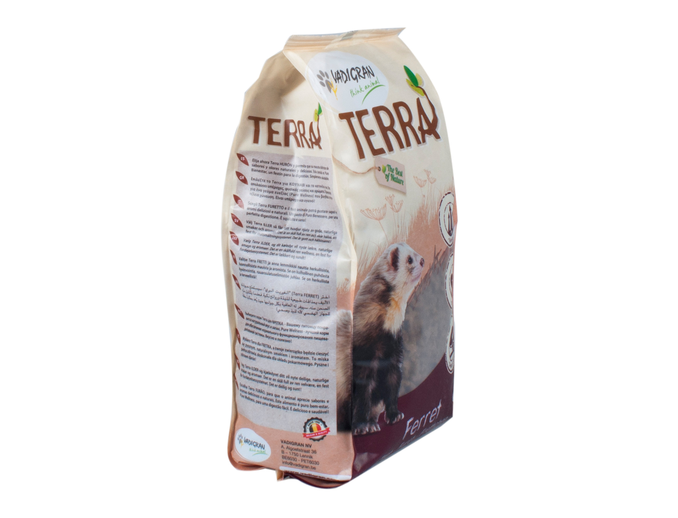 Kies nu voor TERRA fret en laat uw huisdier genieten van de heerlijk, natuurlijke smaken en geuren. Deze maaltijd is Pure Wellness en goed voor de vertering. Lekker gezond! Fretten hebben dierlijke eiwitten nodig. Dierlijk vet is een goede energiebron en bevat goede vetzuren.De juiste verhouding omega 3/6 vetzuren is belangrijk voor de gezondheid en het welzijn van uw dier.Dit menu is samengesteld uit harde en knapperige brokjes die bijdragen aan het voorkomen van tandsteen. Zo blijven de tanden schoon.