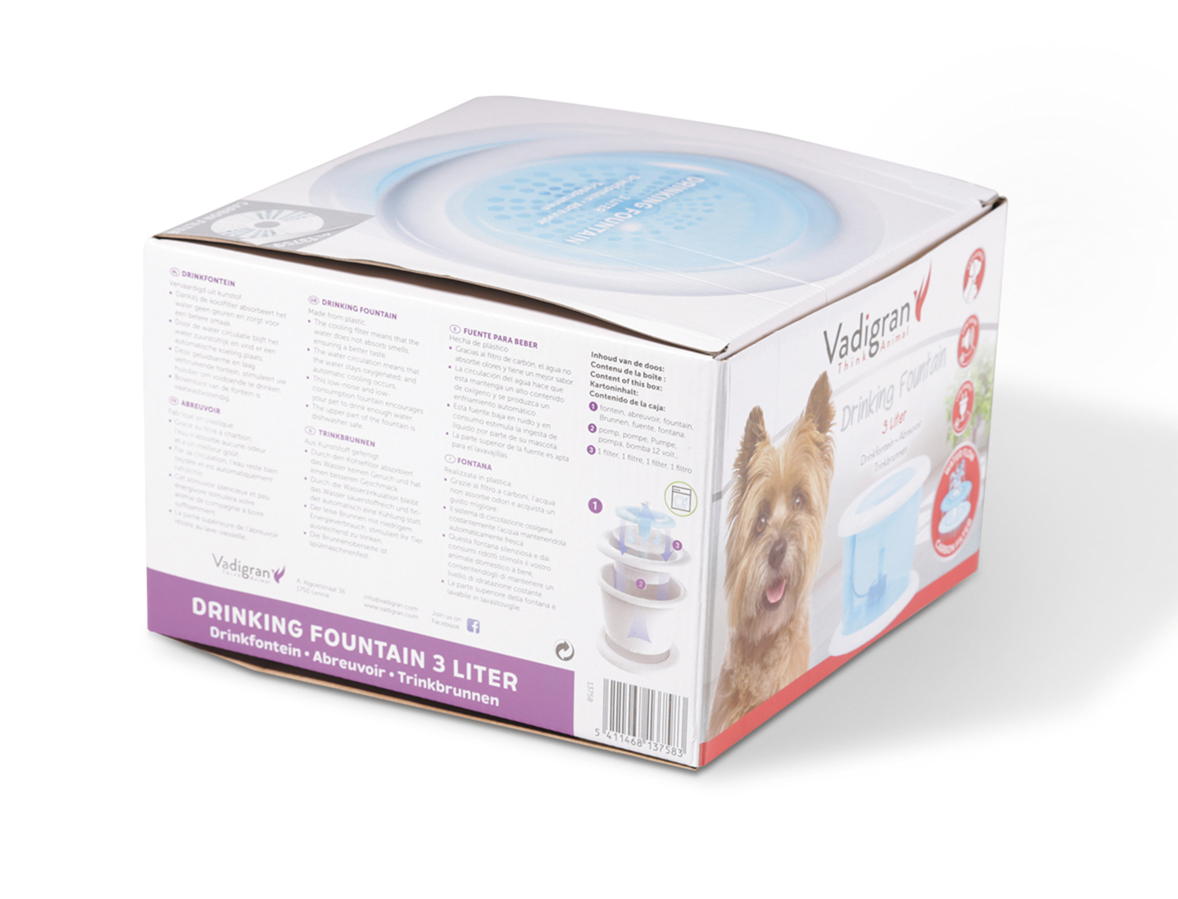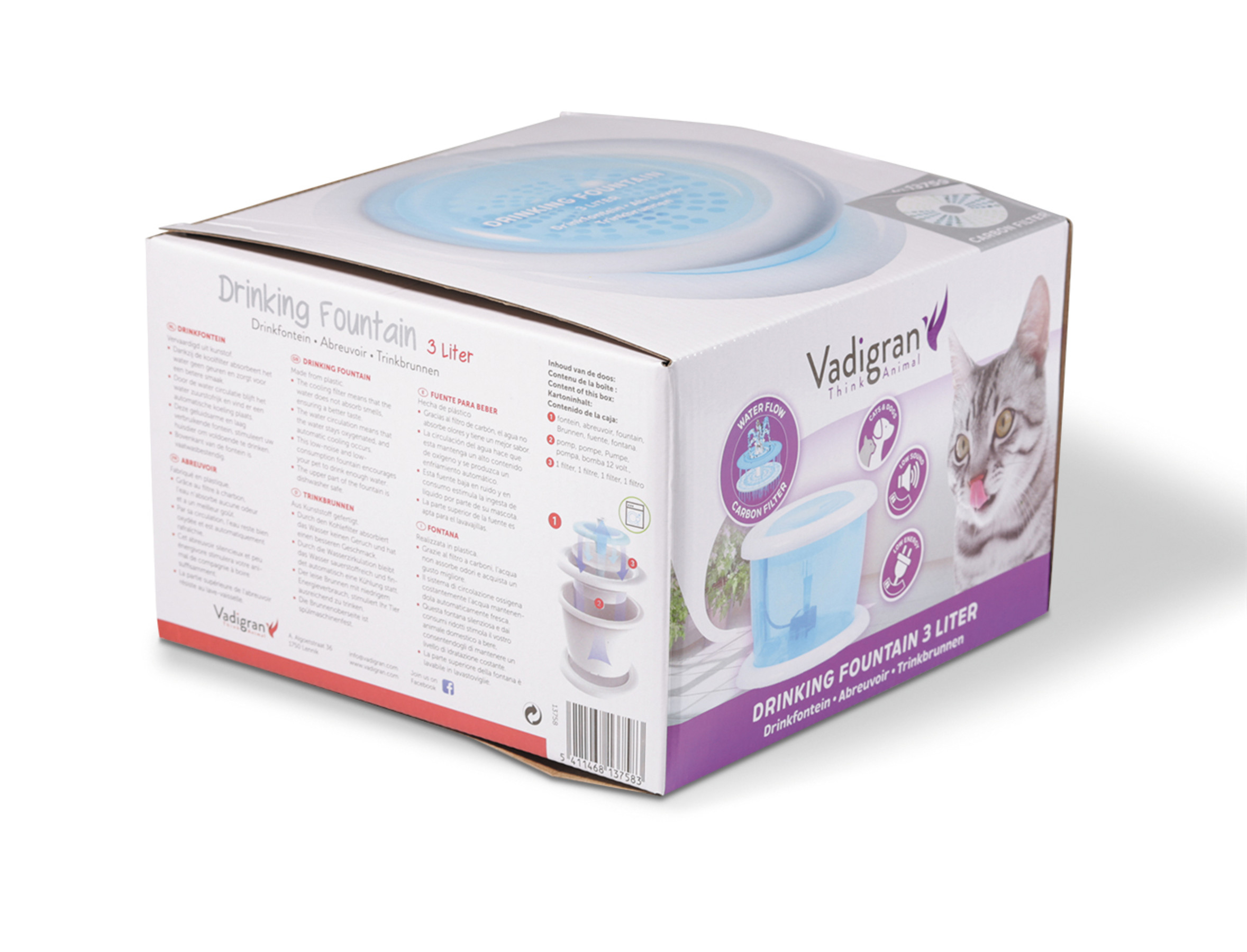 Deze plastic waterfontein zorgt voor koel, stromend water. Het water is geurloos en smaakt beter. Stimuleert je huisdier om meer te drinken.Het water bevat meer zuurstof en blijft natuurlijk vers dankzij de constante circulatie. Het reservoir is transparant waardoor u makkelijk het waterniveau in het oog kan houden.De fontein beschikt over en pomp en een houtskoolfilter**, het water wordt op die manier permanent gefilterd en blijft dus zuiver en helder.De pomp maakt weinig geluid en verbruikt weinig elektriciteit. Geschikt voor kleine huisdieren zoals honden of katten.